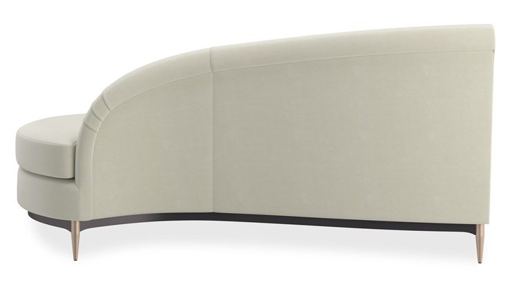 Product Description: Caracole UPH-424-RH1-D Three's Company RAF Chaise - This regal sectional makes a dramatic showpiece that emanates glamour. Upholstered in velvet, its curved profile is complemented by sumptuous comfort. Reflecting the gracious elegance of the Hollywood Regency era, it features a shapely back button-tufted with vertical, cuff link-inspired gold metal bars. Its lower edge and outer arms are trimmed in Almost Black while its metal tapered feet are finished in Champagne Gold. Artful from edge to edge, this statement piece creates drama wherever it goes.