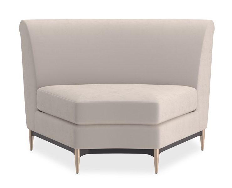 Product Description: Caracole UPH-424-WE1-E Three's Company Wedge - This regal sectional makes a dramatic showpiece that emanates glamour. Upholstered in velvet, its curved profile is complemented by sumptuous comfort. Reflecting the gracious elegance of the Hollywood Regency era, it features a shapely back button-tufted with vertical, cuff link-inspired gold metal bars. Its lower edge and outer arms are trimmed in Almost Black while its metal tapered feet are finished in Champagne Gold. Artful from edge to edge, this statement piece creates drama wherever it goes.