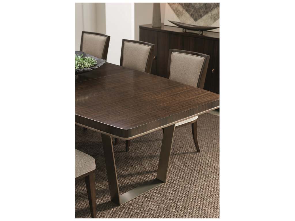 Product Description: Caracole M022-417-201 Modern Streamline Streamline Dining Table - The memorable grain of fumed figured eucalyptus comes to life atop a dining table that is suspended by angled, contemporary metal braces. The wood's Aged Bourbon finish results in a commanding presence that can be expanded to easily seat 10 people. The accent molding is showcased in a band of Smoked Bronze that matches the sculptural metallic legs. The rounded rectangular shape of this table encourages conversation over a great meal.
