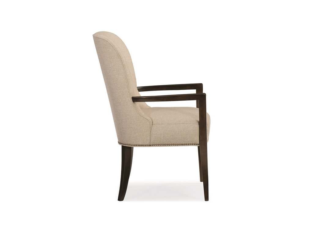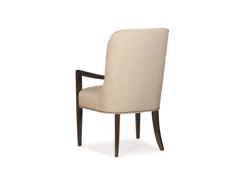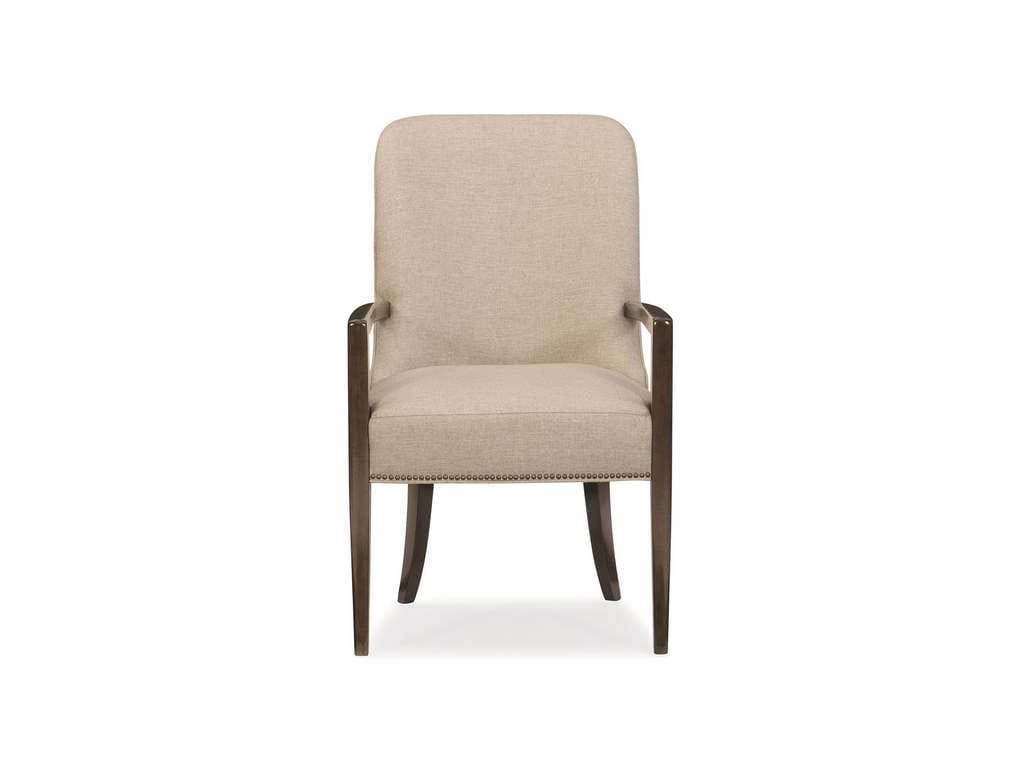 Product Description: Caracole M022-417-271 Modern Streamline Streamline Arm Chair - Clean, classic lines can be found in the Streamline Arm Chair. Fully upholstered in a neutral brushed fabric, its open, squared-off arms and tapered sabre legs are finished in Bourbon Glaze. With its band of brass nails at the base, these chairs pair well with modern and transitional pieces.