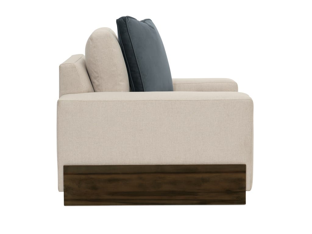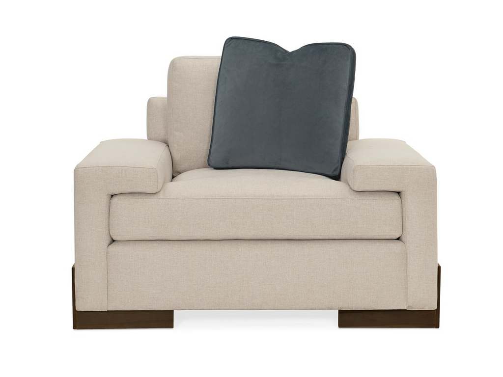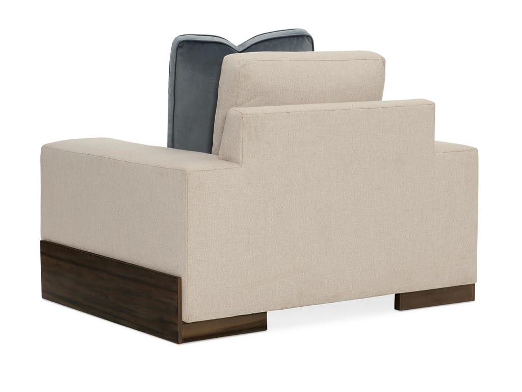 Product Description: Caracole M090-018-031-A Im Shelf ish - Embodying design without limits, this sublime chair adds rich character to a space. Understated charm emanates comes from its clean, linear profile where its seat cushion nests under a wide shelf-arm. Inspired by modern organic design, it features a neutral, linen-like textured fabric with a petite herringbone pattern and includes a velvet accent pillow in a sophisticated shade of slate blue. An angular Fumed Gum wood base finished in Smoked Sable cradles the frame and imparts a finishing touch that grounds its design presence.