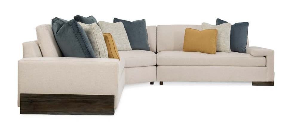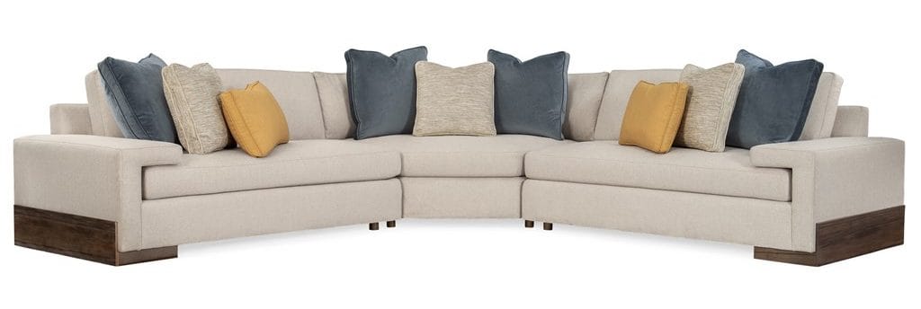 Product Description: Caracole M090-018-SEC1-A Im Shelf ish - Create a destination in your home with the refined character and comfort of this stunning sectional sofa. Unique by design, its seat cushions nest under a wide shelf-arm creating statement-making style. A thoughtfully designed center wedge features a wood shelf finished in Smoked Sable that provides a place for snacks and beverages while concealing a pop-up with multinational AC and USB charging plugs. Destined to be a favorite spot for resting and relaxing, this sectional is upholstered in a neutral, linen-like fabric with a small, modern herringbone pattern. Accent pillows in shades of slate and goldenrod add impact and style. An angular Fumed Gum wood base finished in Smoked Sable cradles the frame and imparts a finishing touch that grounds its design presence.