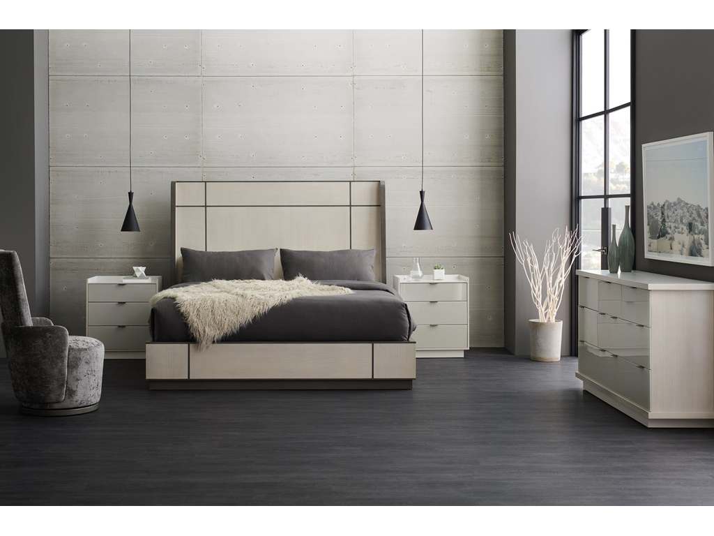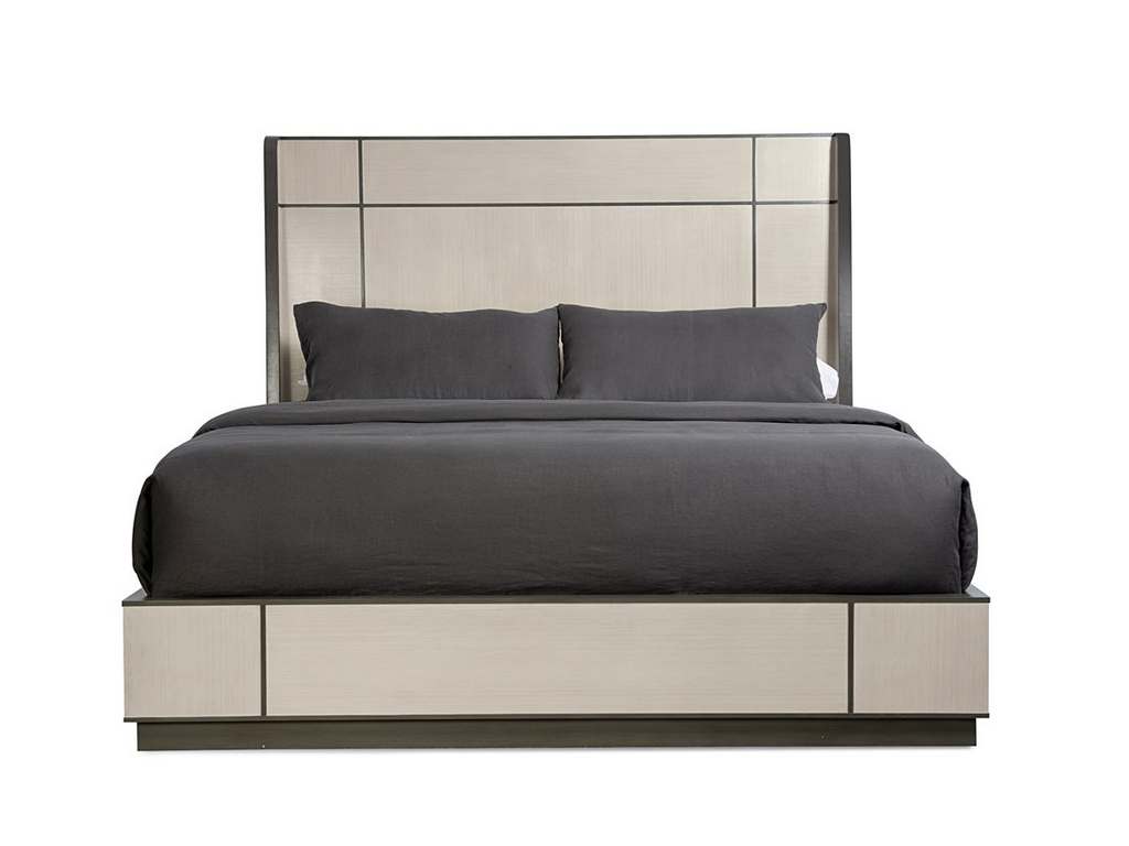 Product Description: Caracole M123-420-121 Modern Expressions King Bed Wood - For connoisseurs of art and architecture, the Repetition Wood Bed is destined to be a favorite. Its commanding presence is comprised of an upholstered headboard panel framed in Ashe Taupe outlined by a contrasting wood inlay in Zinc Oxide. Angled wrap-around sides and a plinth base in Zinc Oxide add even more character to this sophisticated adjustable-height bed.