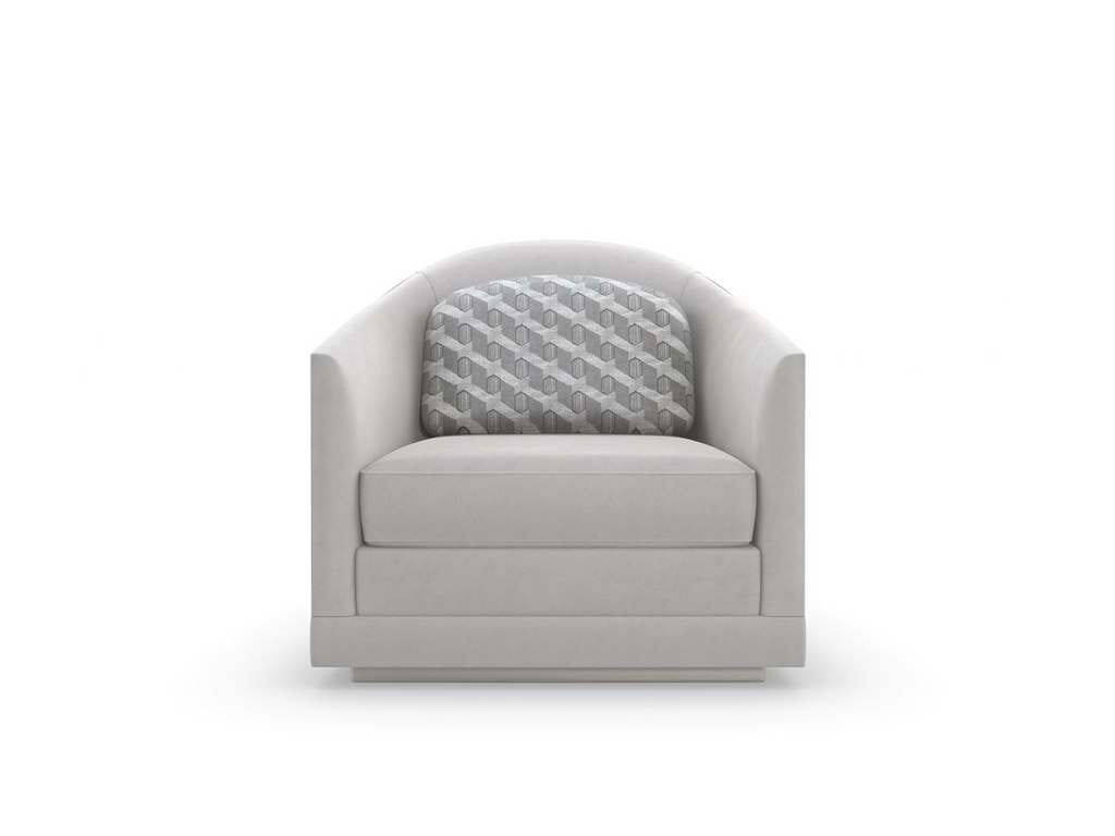 Product Description: Caracole M130-421-031-A La Moda Da Vita Chair - Captivating companion to our Da Vita sofa, this curved-back chair introduces an elegant Italian modern aesthetic. Its smooth upholstered back and gently flared arms beckon in a luxurious performance velvet, complemented by a back pillow in a contemporary woven pattern and a clean plinth base in shimmering Soft Silver paint.