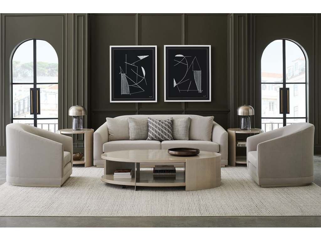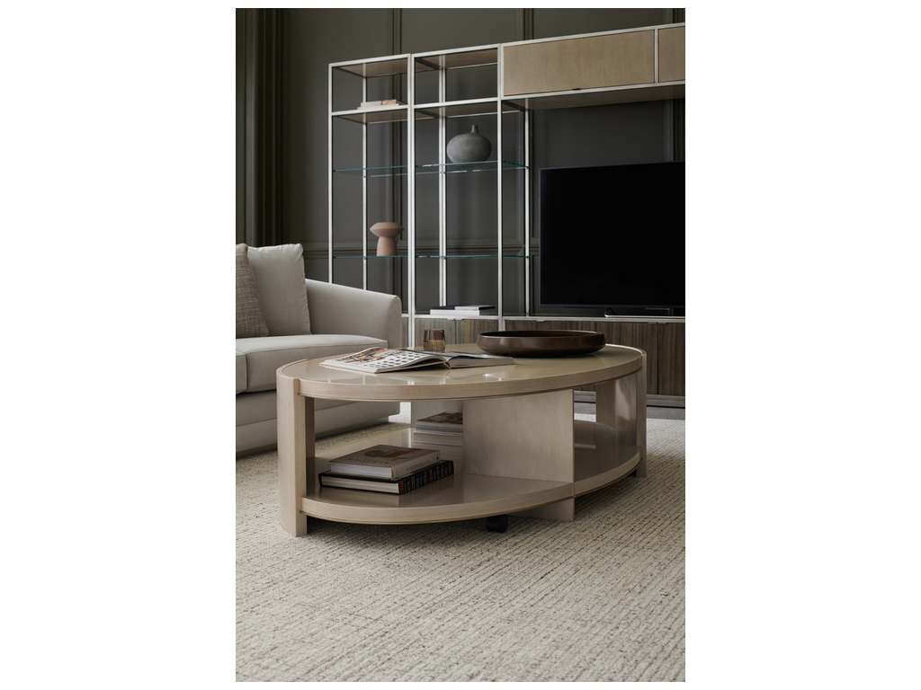 Product Description: Caracole M131-421-402 Da Vita Cocktail Table - With a refined oval shape and subtle radiance, this cocktail table is a captivating addition to living interiors. Elevating its simple form, a Thunder finish gives light to the linear wood grain, accentuated by metal trim in Soft Silver paint. Like a work of art, every view brings a different perspective, with meticulously designed space for displaying books and collectibles. Hidden casters allow for ease of mobility.