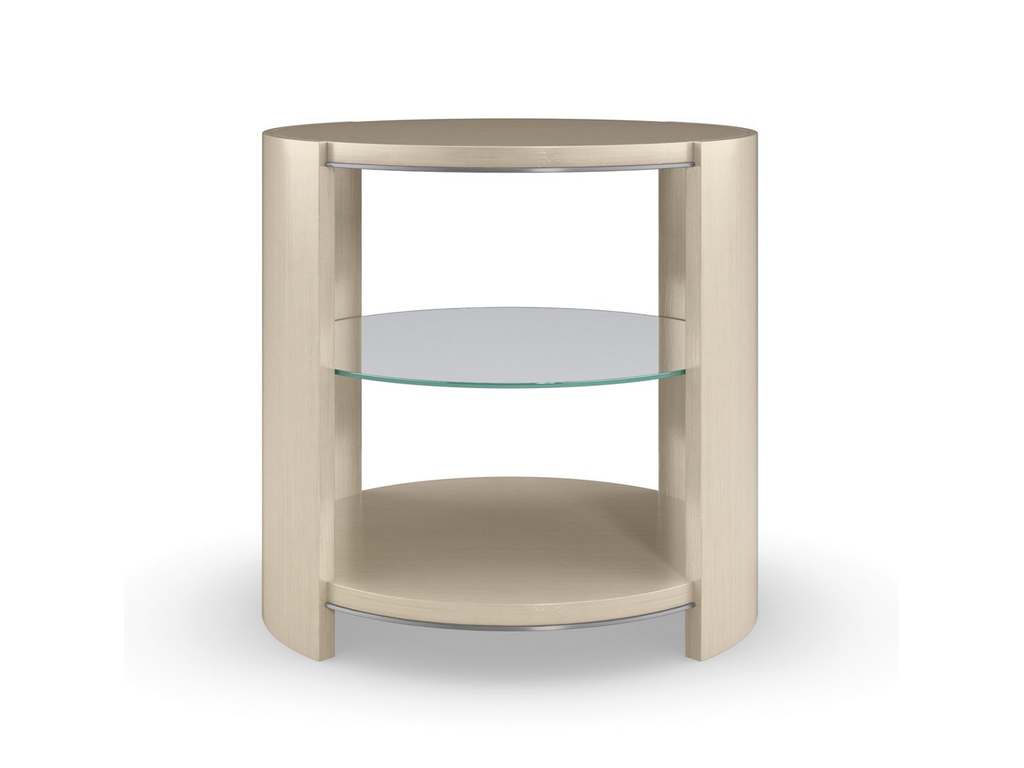 Product Description: Caracole M131-421-412 Da Vita Round End Table - A softly rounded form with an exquisite finish, this end table makes a captivating addition to living interiors. Open at the center for storage and display, its sculptural shape is accentuated by a linear wood grain and Soft Silver paint. Features an adjustable glass shelf that lets your unique style take center stage. Well-scaled to use on either side of a sofa, or alongside a statement chair.