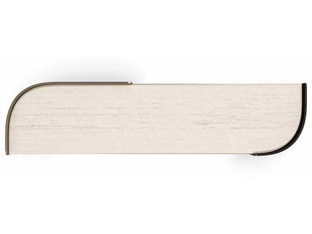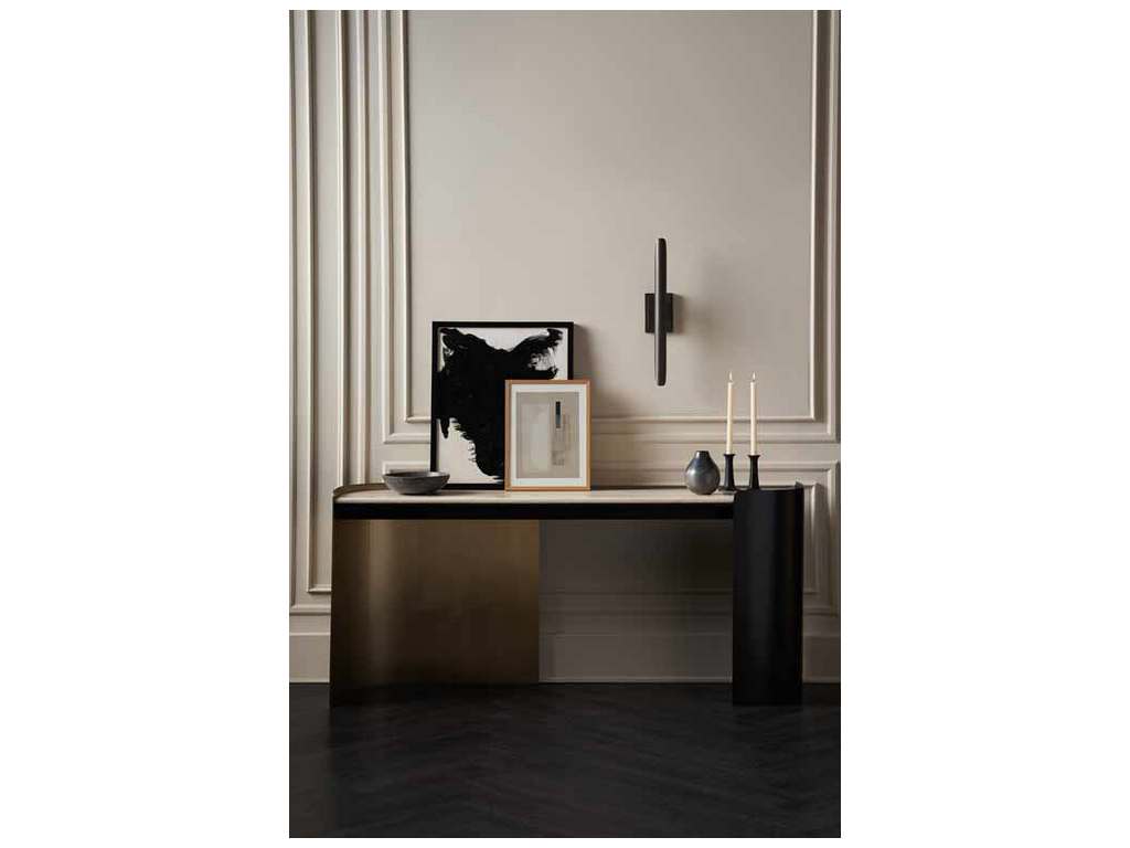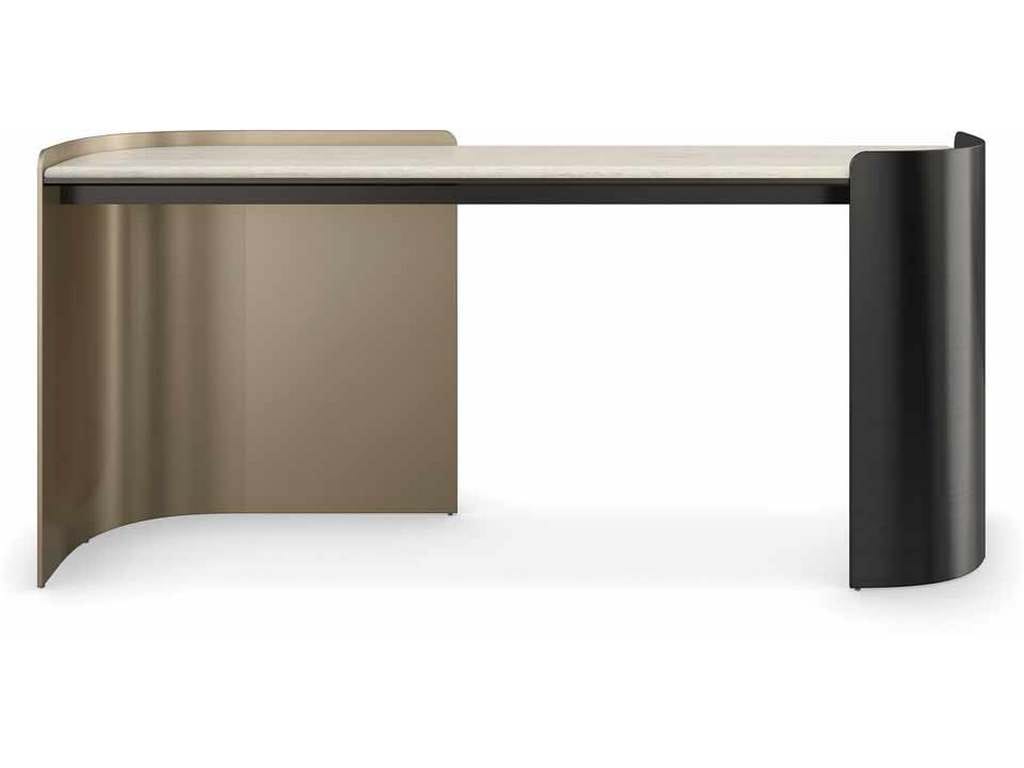 Product Description: Caracole M141-022-441 Movement Desk - With an inherent rhythm and sleek design, the Movement console is fluid in both form and function. Artfully integrating sensual curves with muted lines, a Creme Travertine stone top is balanced on metal legs in contrasting bronze finishes for added drama. Makes an alluring statement in halls, entryways, and home offices as a minimalist desk.