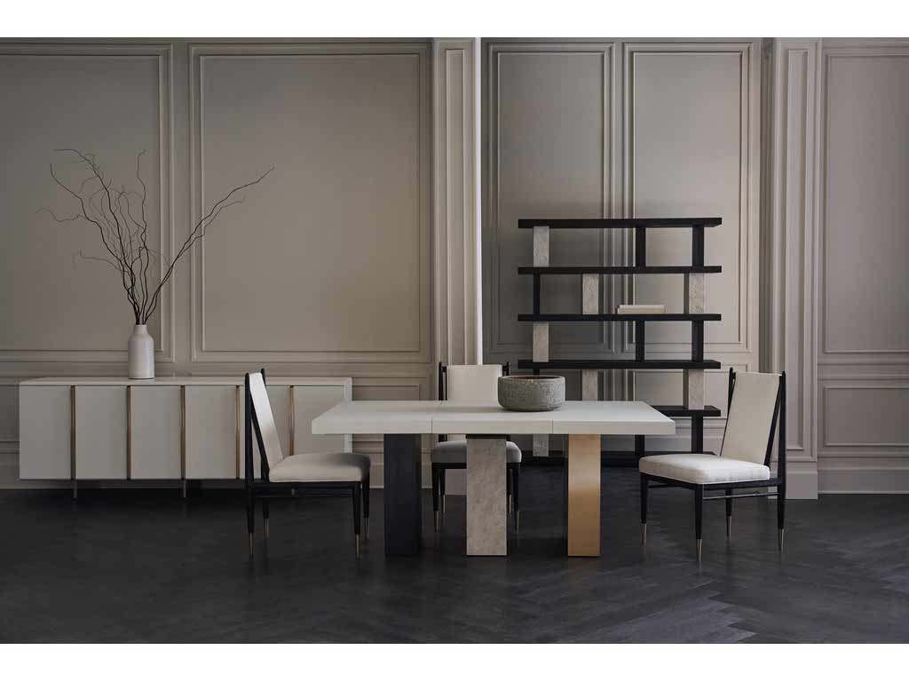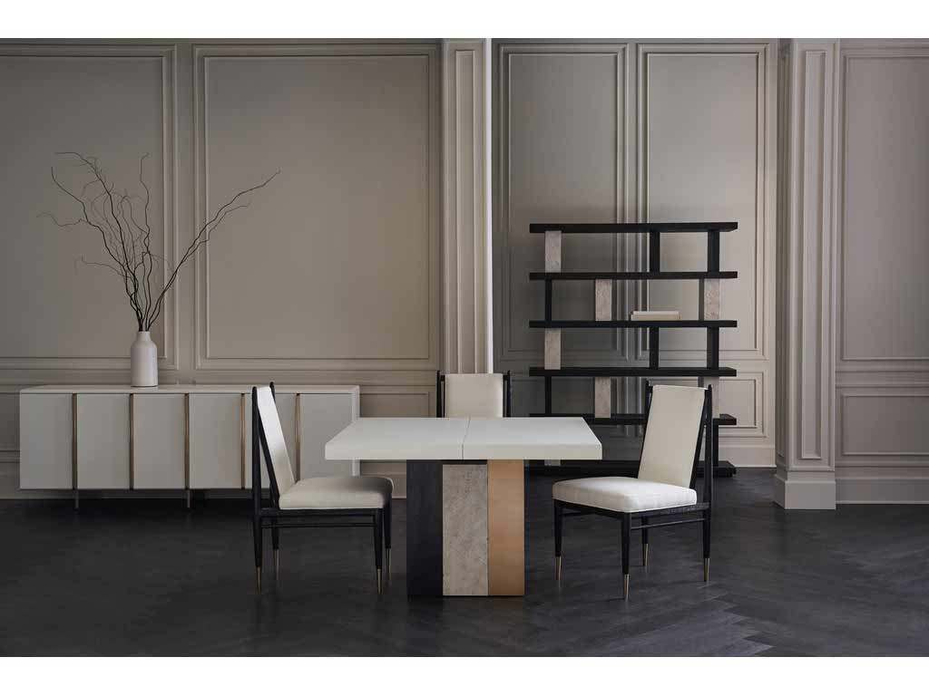 Product Description: Caracole M142-022-203 Modern Principles Unity Dark Dining Table - Form and function in perfect harmony: the Unity dark dining table makes a dramatic statement in a unique mix of materials. Architectural lines are punctuated by a tactile top in Burnished Adobe, balanced atop a pillar-style base crafted in travertine stone, Cinder-finished oak and Lucent Bronze plated metal. Style as a small pedestal for an intimate dining experience, or expand with two leaves for a larger gathering of guests. Table seats 10 when fully extended.