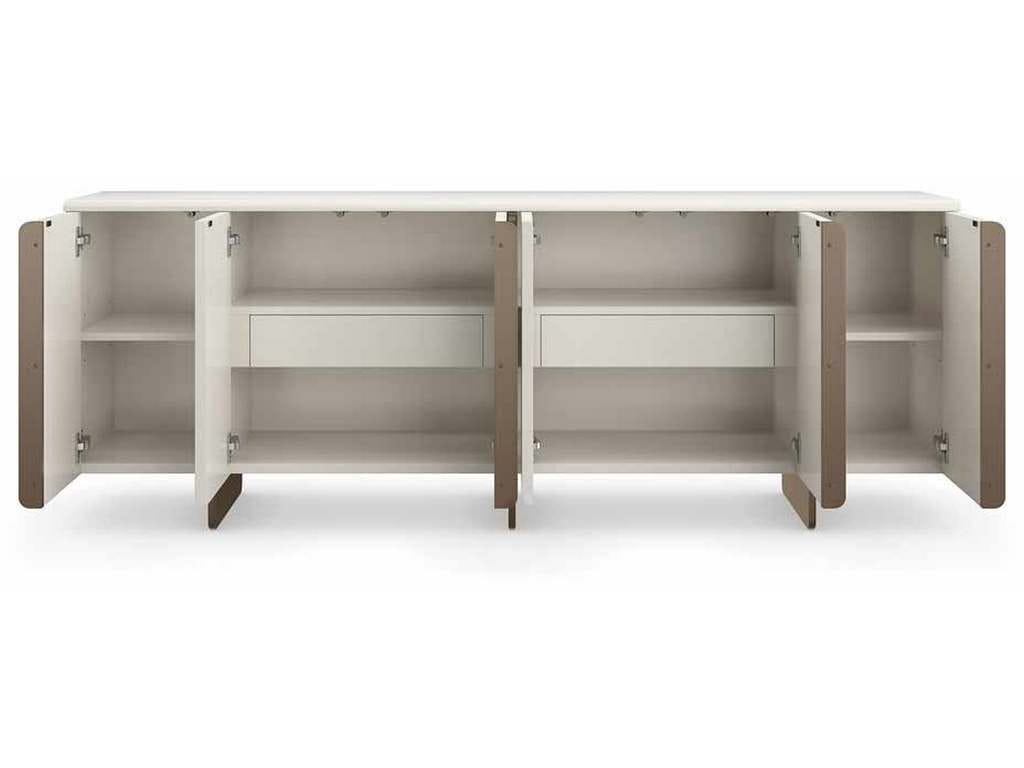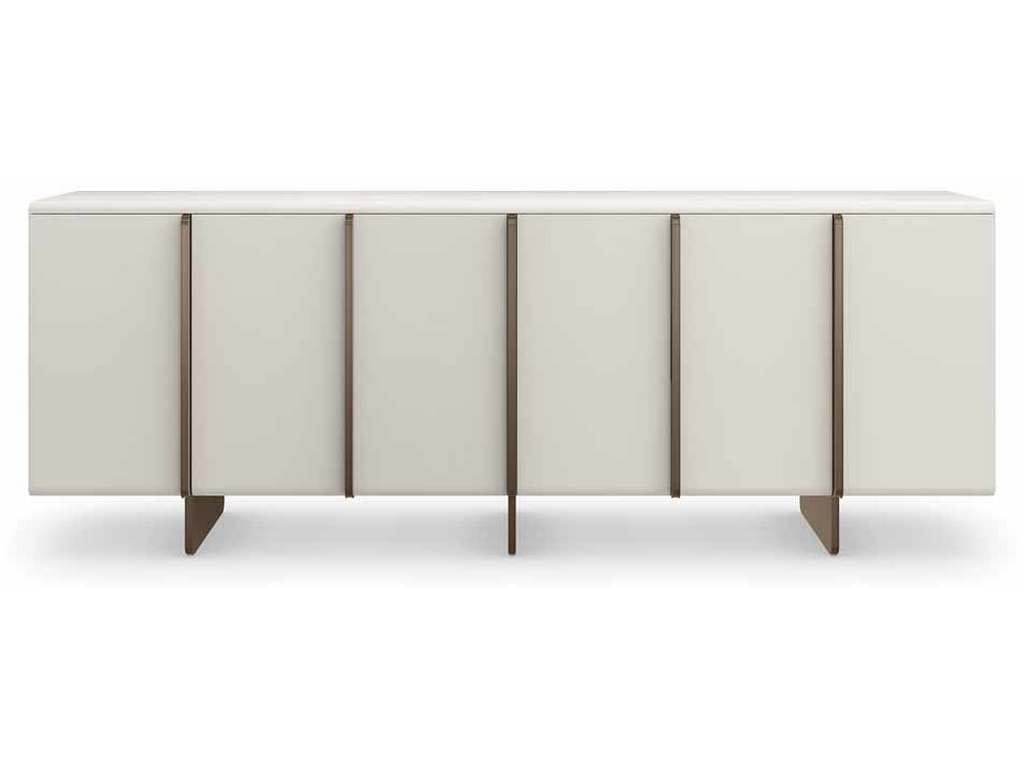 Product Description: Caracole M142-022-212 Emphasis Credenza - An innovative textured adobe finish lends depth and an organic element to this modern take on a 1940s-era Italian design. Sensory and sophisticated, its simple linear form features gently rounded edges and soft-close doors trimmed in a warmly accentuating, Lucent Bronze plated metal. Versatile in form and function, it offers a chic storage solution for dining and living rooms, hallways and home offices.