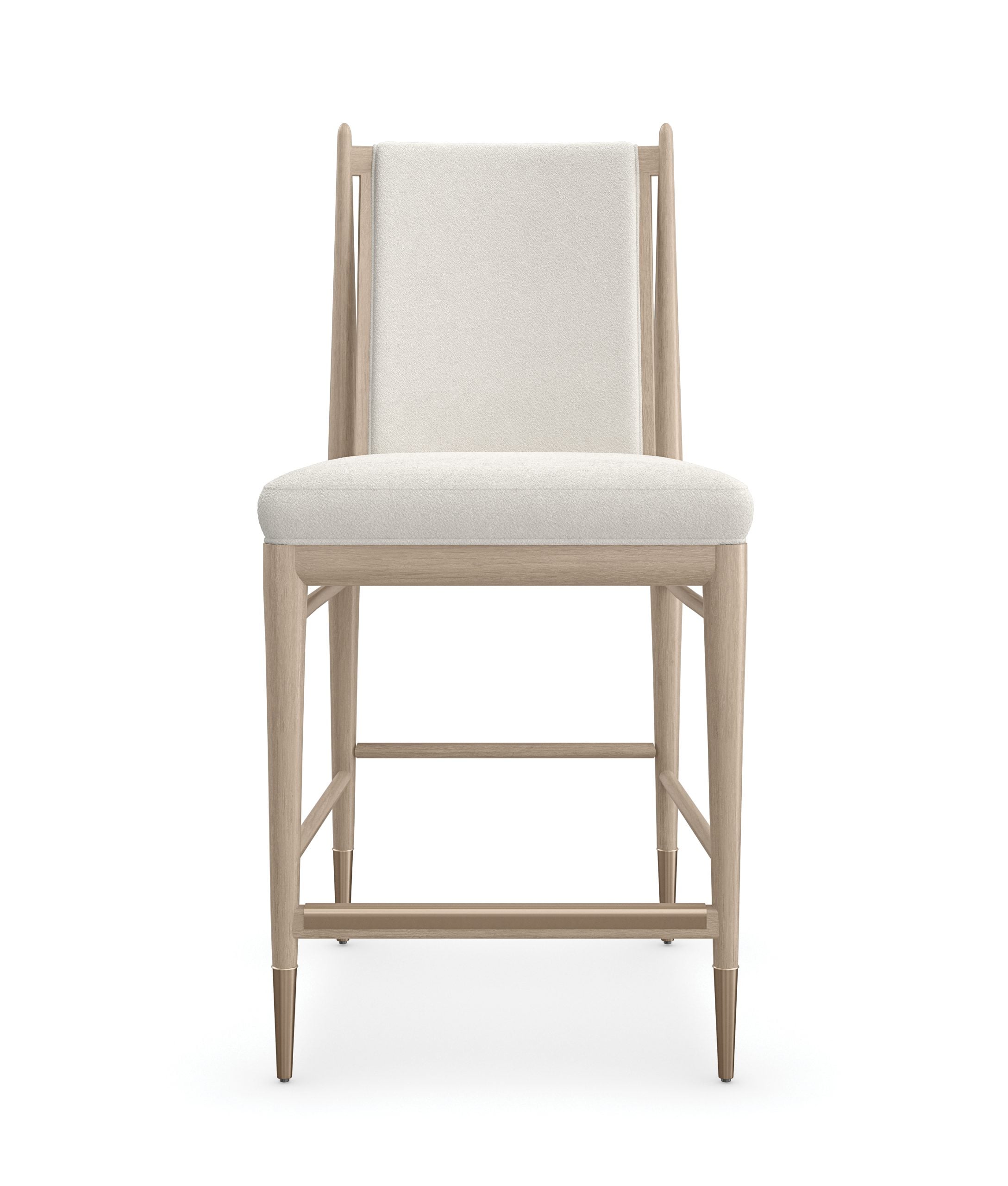 Product Description: Caracole M142-023-311 Unity Light Counter Stool - An elegant expression of materiality and form, the Unity light counter stool is perfectly scaled for entertaining and the everyday. A clean-lined frame crafted in Sun Drenched open grain oak sets it apart from its dark counterpart. Dressed in an ivory boucle fabric and Lucent Bronze metal ferrules, its subtle contrast brings a fresh modern aesthetic to dining and entertaining spaces. Bar height stool also available.