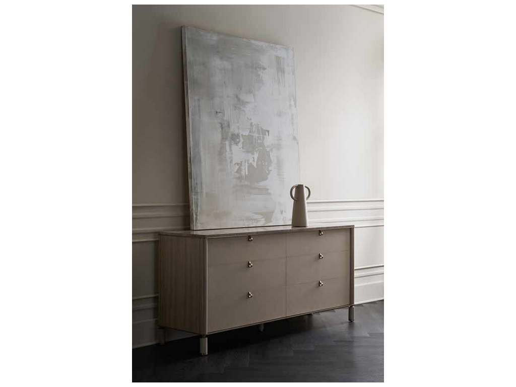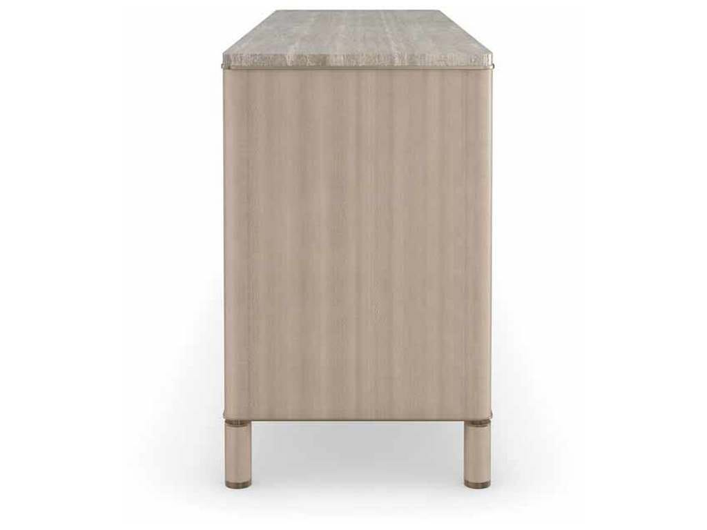 Product Description: Caracole M143-022-031 Balance Dresser - Light tones and organic textures in perfect balance exude a refined modern elegance. Soft-to-touch, vinyl wrapped drawers are complemented by Silver Platano wood veneers and a polished travertine stone top. Metal accents and a base in Lucent Bronze add warmth and subtle contrast to its calming, clean-lined form.