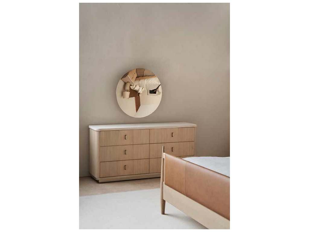 Product Description: Caracole M143-022-032 Modern Principles Rhythm Dresser - Tactile reeded drawer fronts in a Sun Drenched Oak finish create visual rhythm, quietly contrasted by a creamy Travertine stone top. Rounded corners and bronze drawer pulls with a subtle contour soften its linear form and add a touch of warmth. Features six spacious drawers with Linen-painted interiors for neatly keeping bedroom essentials. Style as a console to make a striking statement.