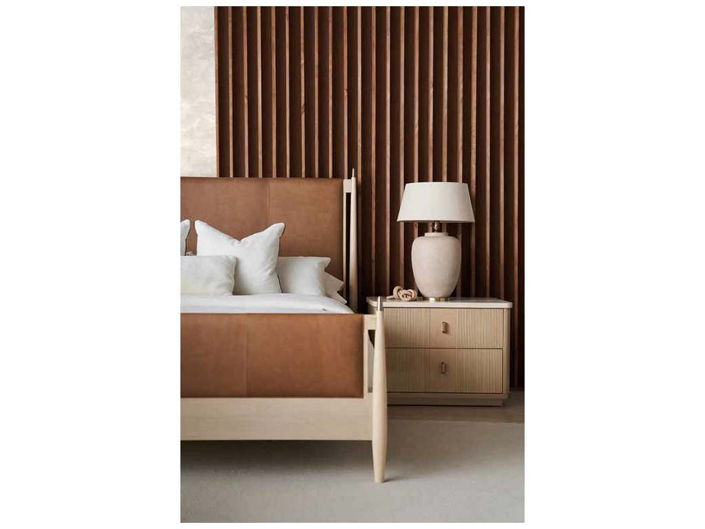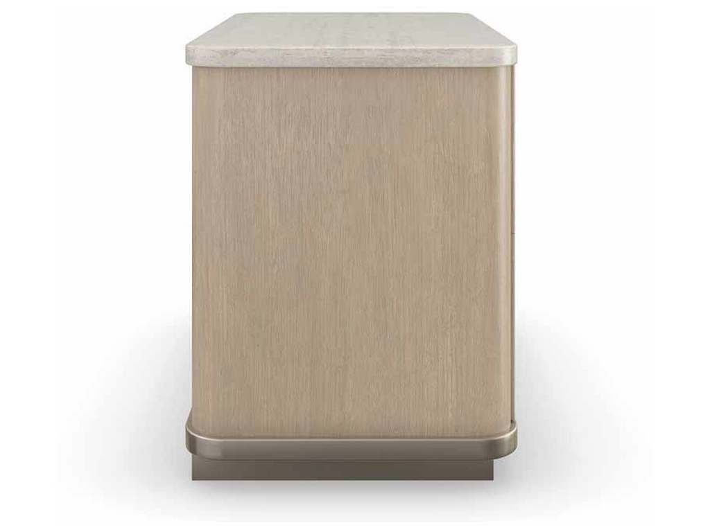 Product Description: Caracole M143-022-061 Modern Principles Rhythm Nightstand - The natural beauty of Sun Drenched oak and a creamy Travertine stone top is punctuated by the visual rhythm created by reeded drawer fronts. Rounded corners and bronze drawer pulls with a subtle contour soften its linear form and add a touch of warmth. Features Linen-painted drawer interiors and access along the back for wire management.