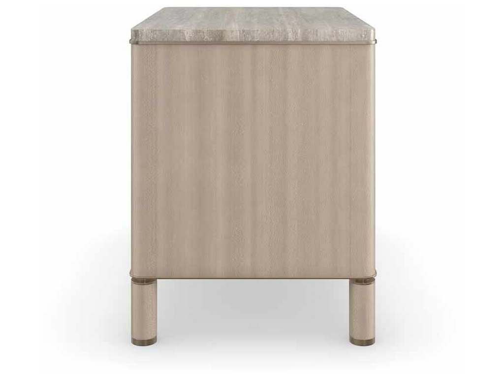 Product Description: Caracole M143-022-062 Balance Drawer Nightstand - A quietly alluring bedside companion, this nightstand exemplifies balance in material and form. Features soft-to-touch, vinyl wrapped drawers, complemented by Silver Platano wood veneers and a polished travertine stone top. Metal accents and a base in Lucent Bronze add warmth and subtle contrast.
