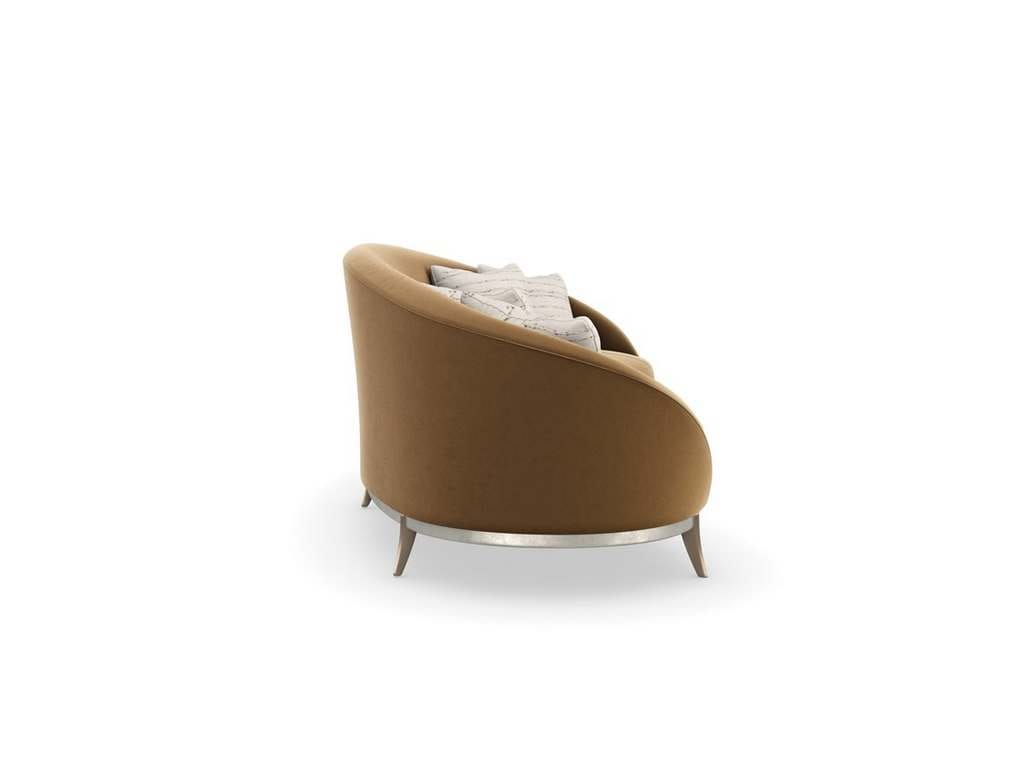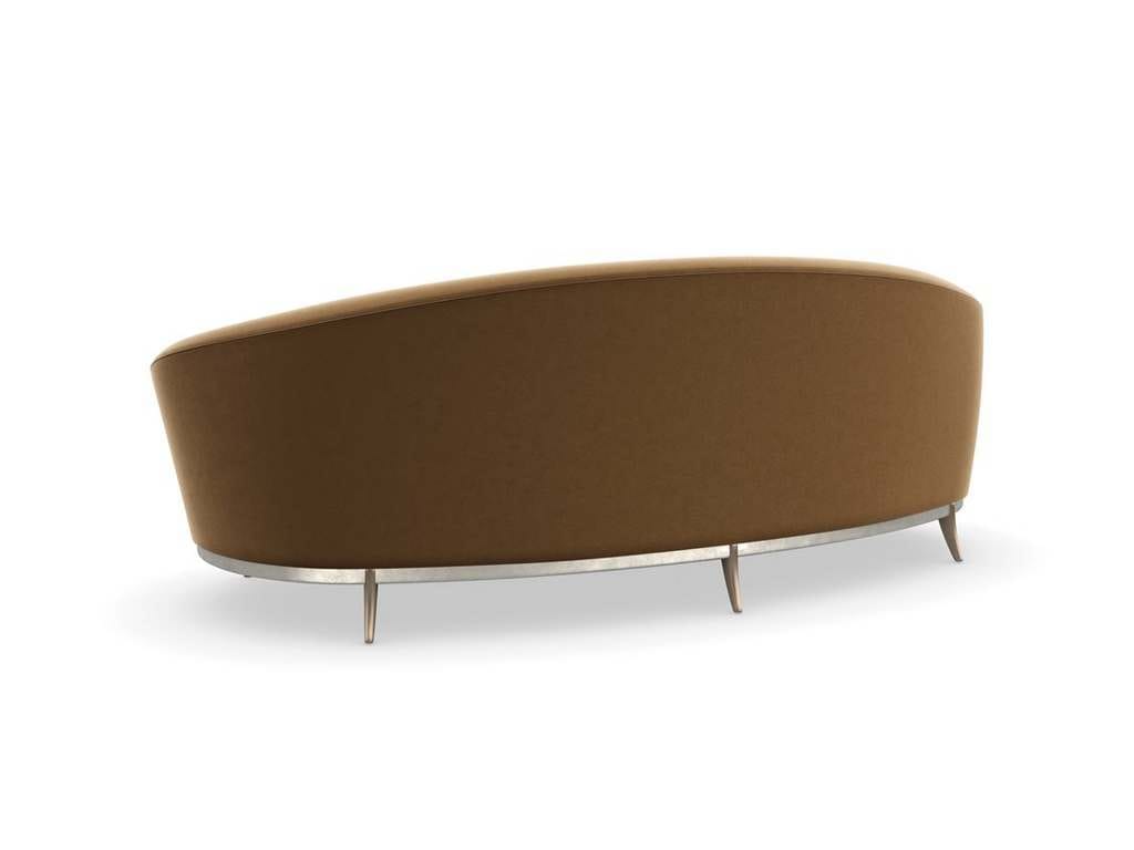 Product Description: Caracole SGU-021-011-A Main Event Sofa - With an iconic kidney shape, this sumptuous sofa offers enveloping comfort in a warm caramel-colored velvet. Its gracefully flowing form features a smooth back and bowed bench seat, with French seams for a distinctive accent. Bronze sabre-style legs elevate its curved wood base, finished in Duty Silver for a touch of luxe. Toss pillows in a shimmering cut velvet add a painterly stripe and pop of contrast.
