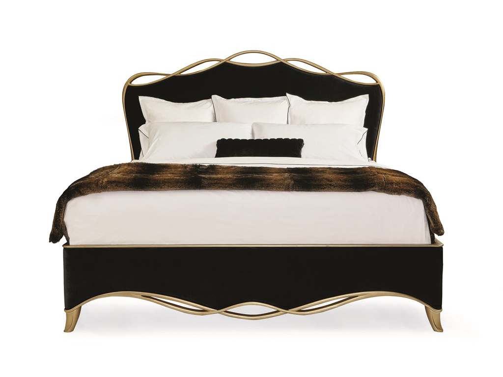 Product Description: Caracole SIG-416-123 Signature Promethean The Ribbon Bed King - Graceful in its softness and refinement, The Ribbon is a bed that will wind its way into your heart. The delicately carved frame curves around the headboard and flows down along the side rails and footboard in decorative style. Not to be missed is the depth of carving that adds elegant dimension to this sumptuous bed. Bathed in a warm Gold Bullion Leaf finish, the free-flowing wood carving is the perfect trim for the plush black velvet that surrounds the entire bed, embracing you in elegance. The bed is suspended off the floor on rounded trapeze feet. Distinctly French in style, this piece is the prettiest of presents for any bedroom.