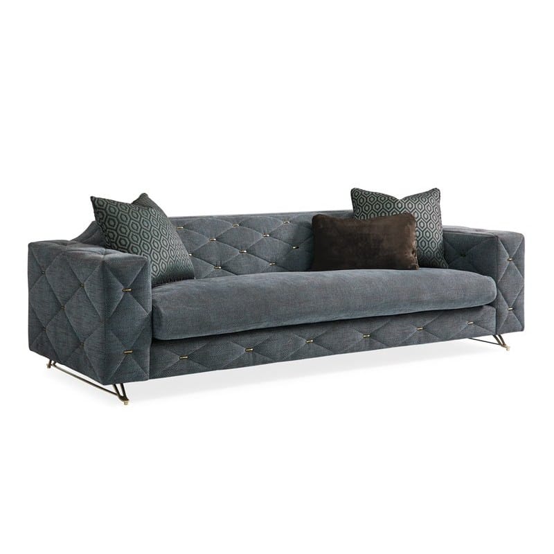 A one-of-a-kind beauty, this distinctive sofa captures the essence of Art Deco brought to life with Mid-century Modern design. Inspired by nature's influences, it features generously scaled arms and the clean lines of bench seating upholstered in a richly textured fabric with a stylish mix of sapphire blue contrasted by bittersweet chocolate. An eye-stopping diamond quilt pattern adds visual dimension, with each tuft punctuated by a metal cufflink-inspired bar tack. Stylish metal legs peek out from underneath and feature an open wishbone shape highlighted in Champagne Gold. Fashionable accent pillows with a embroidered geometric pattern in shades of soft peacock blue and chocolate brown make a coordinated fashion statement, and a fun, faux mink fur kidney pillow completes the sofa's stylish appeal.