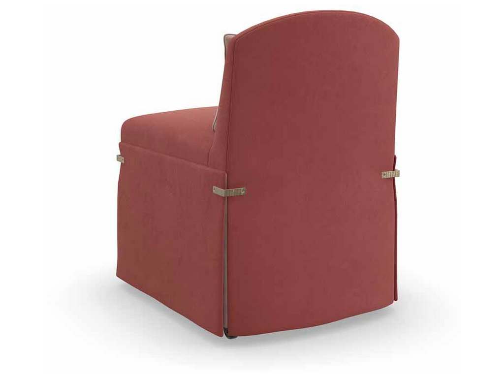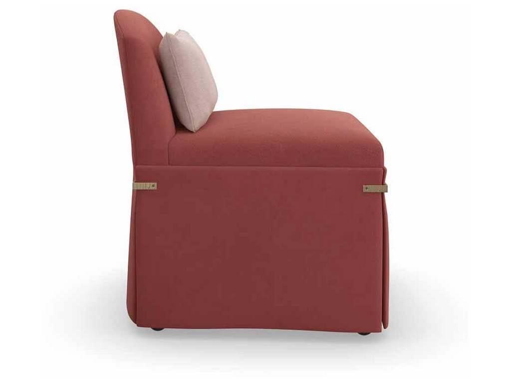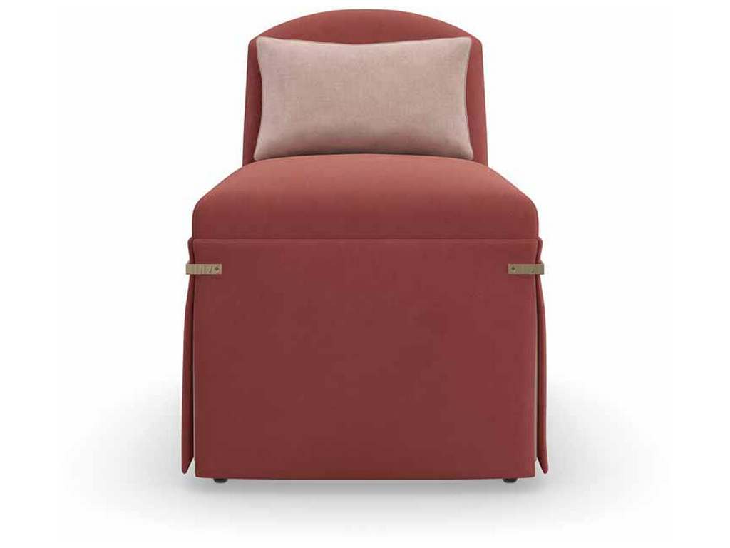 Product Description: Caracole UPH-022-293-A Bustle Chair - This petite seat calls to mind the exquisite detail and drape of a bustle dress, fashionable during the late 1880s. Its elegant silhouette features a low camelback and dressmaker skirt in a dusty rose fabric, cinched together by textured metal brackets in Brushed Gold for a jewelry-like finish. Perfectly scaled to accompany a dressing table or vanity.
