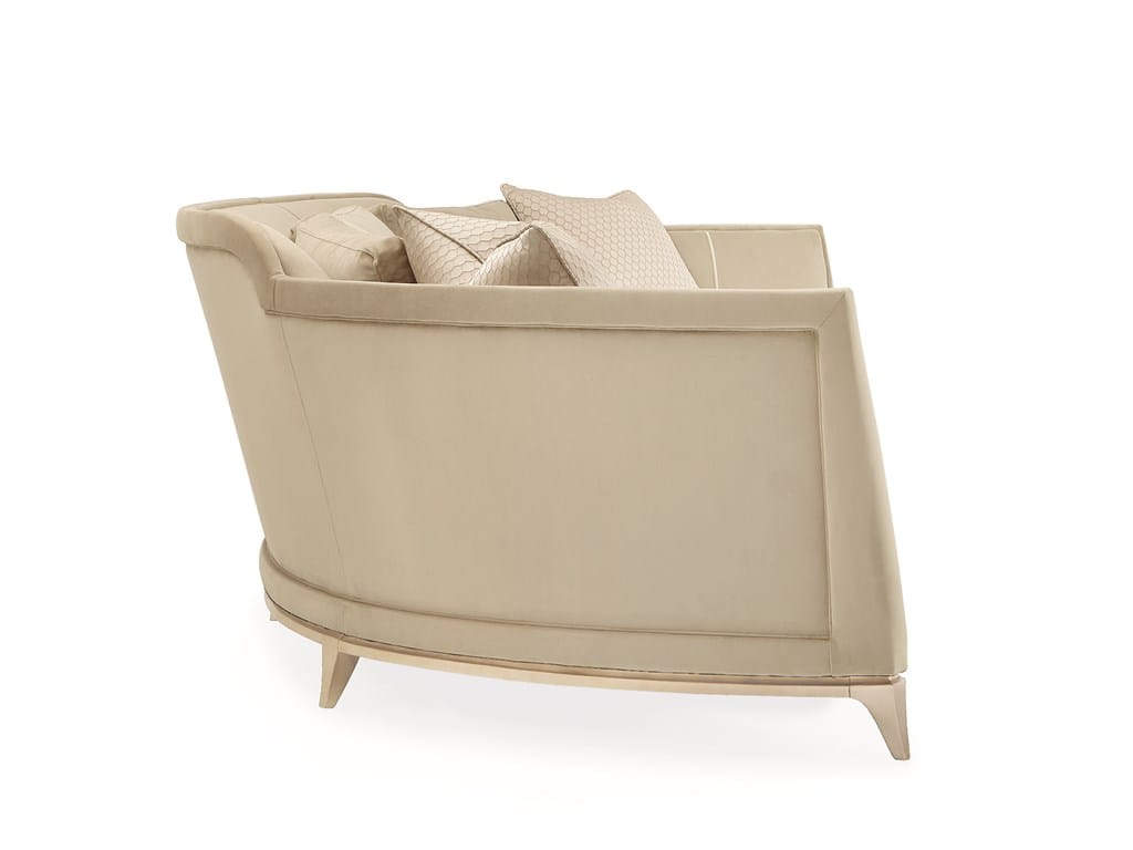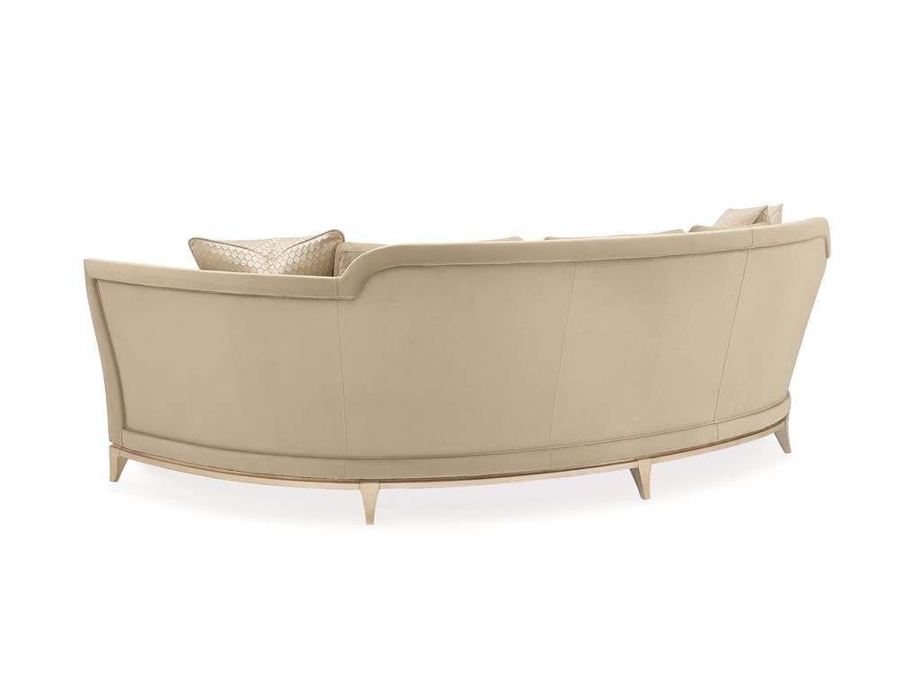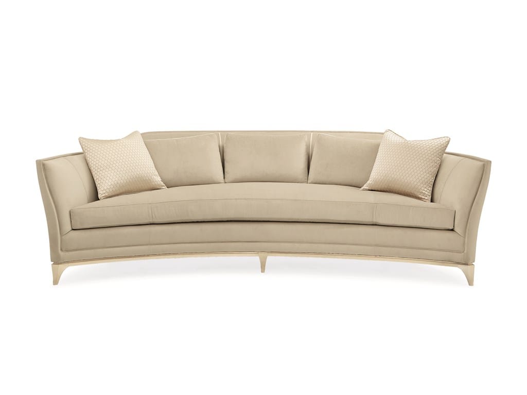 Product Description: Caracole UPH-417-016-A Bend The Rules Sofa - Equally at home in the city or country, this elegant crescent-shaped sofa bends all the rules to create the ultimate in sophisticated seating. Its shapely back and half-moon cushion are accented by a wood base in Soft Silver Paint. Upholstered in a plush, sumptuous buff shade of velvet with a peek-through seam detail on the inside back and arms and throw pillows in an embroidered satin, this sofa's sweeping lines and tailored details create a look that is cosmopolitan chic.