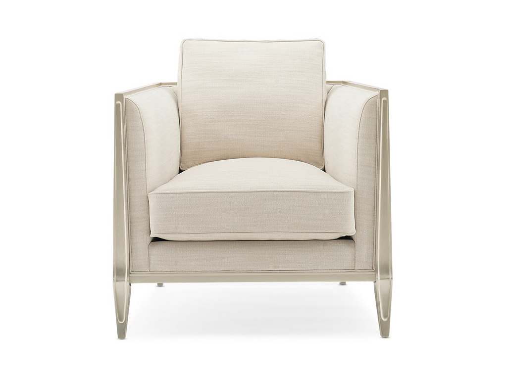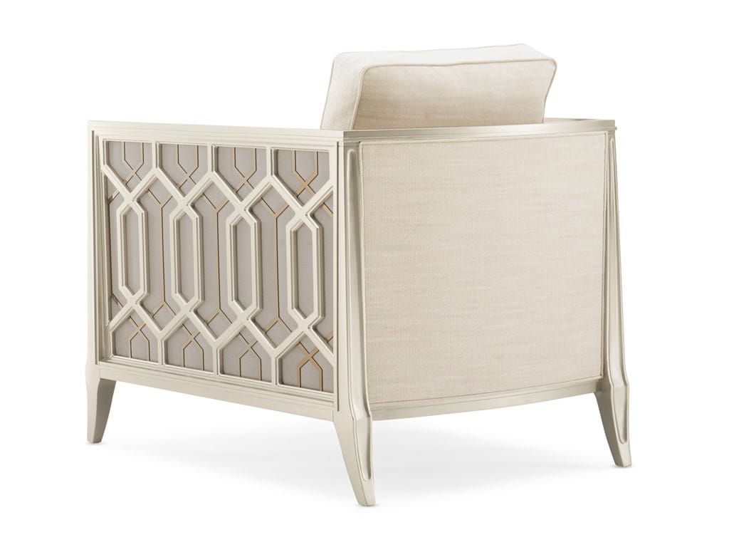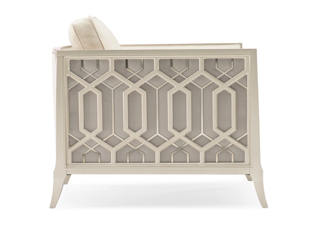 Product Description: Caracole UPH-420-131-A Caracole Classic Just Duet Accent Chair - On a balcony railing of a former palace converted to a hotel in India is a carved pattern that was the muse for the pierced design found on this chair's outer arms. The idea of layering metal fretwork behind the wood was inspired by the dual shadow cast on the balcony by the setting sun through the railing's design. Creating a high-fashion look unique to itself, these elements are highlighted with illuminating shades of Soft Silver Paint and Champagne Gold and an exquisite cover.