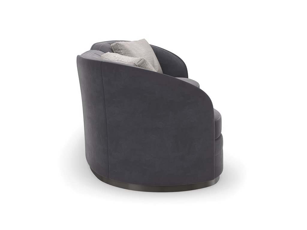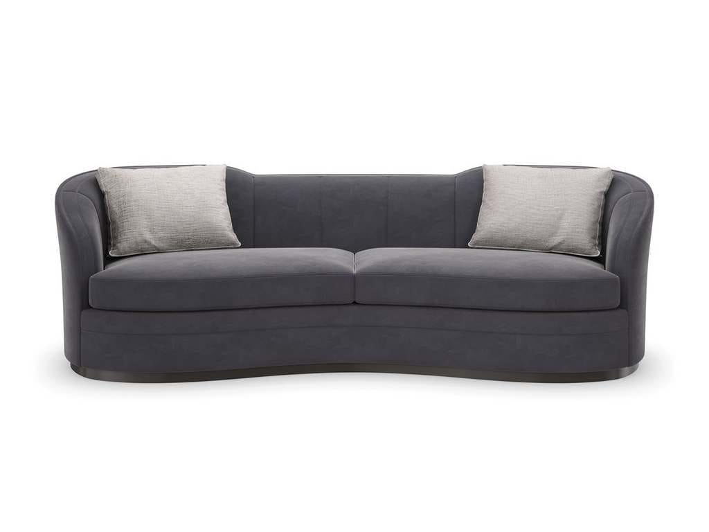 Product Description: Caracole UPH-422-013-A Eclipse Sofa - A Dark Chocolate plinth base accentuates this sofa's Art Deco-inspired lozenge shape, masterfully upholstered in a plush charcoal heathered velvet. Designed with two seat cushions that follow its serpentine front and snuggly sit against its softly curving channeled back. Boxed kidney pillows in a grey and ivory ribbed fabric add contrast and a tactile accent. Style in pairs to create an inviting space for entertaining and conversations.