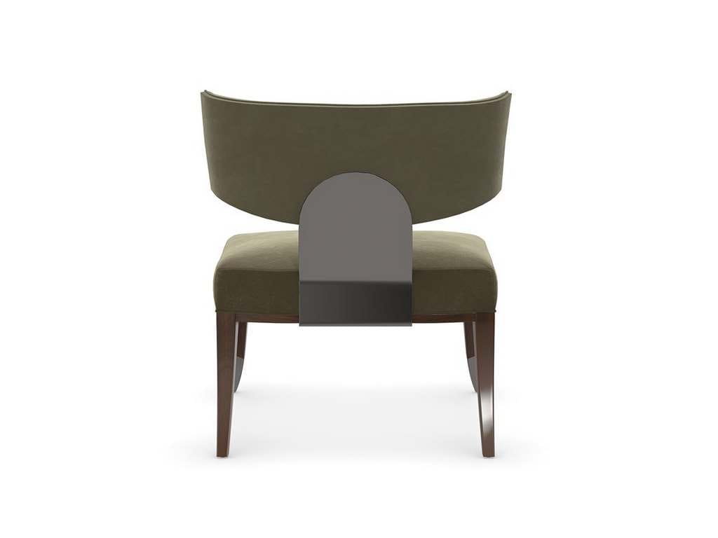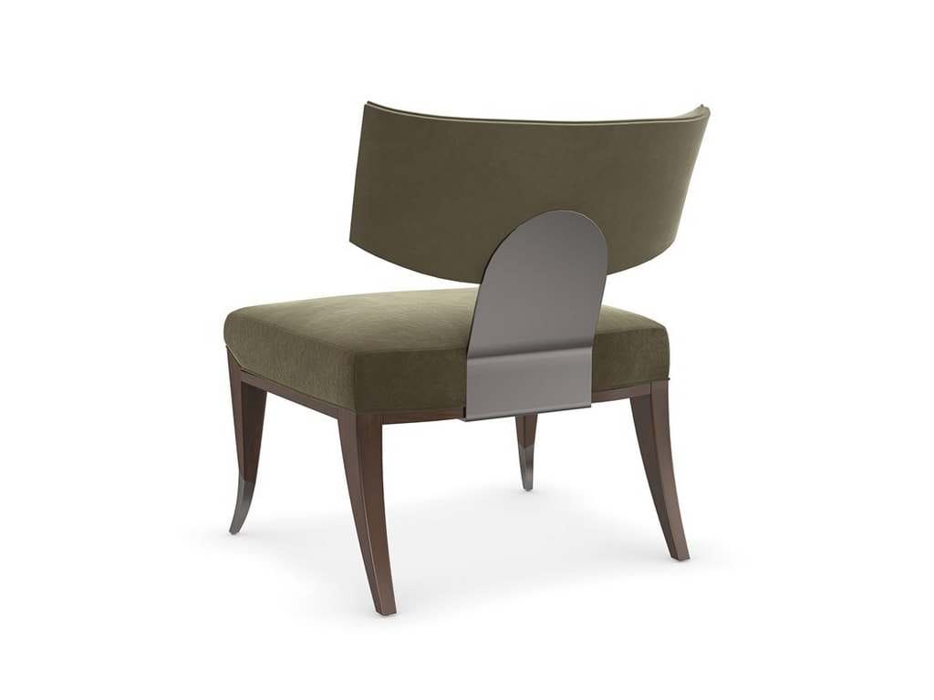 Product Description: Caracole UPH-422-133-A Mykonos Accent Chair - A stylized take on the classic klismos chair, Mykonos brings a sturdy, yet seductive mix of Deep Bronze metal and a luxurious heathered velvet. An arched back plate lends an artful accent, complemented by an exposed wood frame in Bourbon Glaze with outward turning legs, capped in metal ferrules.