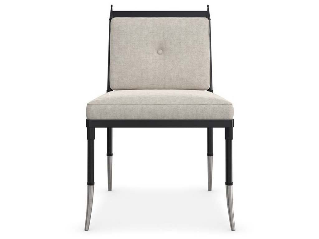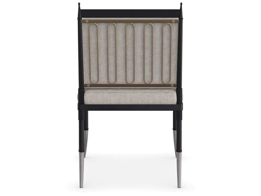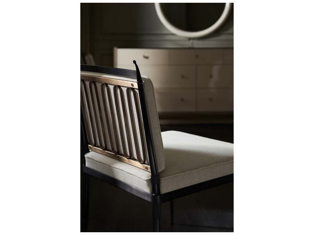 Product Description: Caracole UPH-423-232-A Athena Chair - Inspired by the found beauty of a wrought iron gate, this petite seat balances the strength of metal with an exquisite mix of details and materials. Meticulously tailored in a crisp, light-toned linen, it features a button detail along the inside back and seat, accentuated by scrollwork along the back in a warm Brushed Gold finish. Tall, slender legs capped in Brushed Stainless metal ferrules lend a distinctive finishing touch. Style as a dining chair or mix in conversation spaces for an effortlessly elegant extra seat.