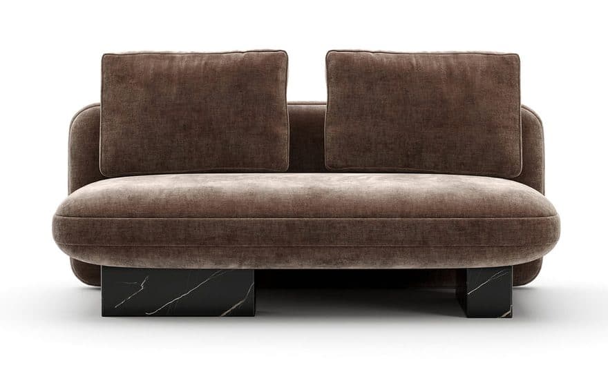 Product Description: Caracole UPH-425V-AL5-A Overlap Armless Loveseat Dk Taupe - The Overlap Armless Loveseat in Dark Taupe vintage velvet combines contemporary luxury with timeless design. Fully upholstered and supported by a striking Nero Marquina stone base, this loveseat provides comfort and elegance perfect for sophisticated interiors.
