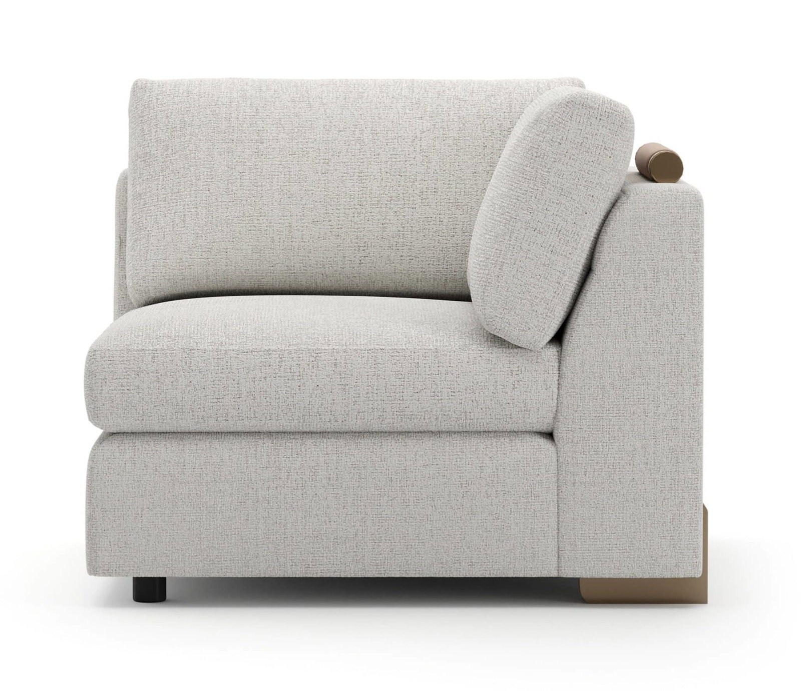 Product Description: Caracole UPH-425V-CR8-A Counter Balance Corner Birch - The Counter Balance Corner in Birch offers a perfect harmony of modern elegance and subtle comfort. With refined oatmeal melange woven fabric with subtle rust threading and sleek Brushed Gold legs, this corner piece adds a chic sophistication to any space.