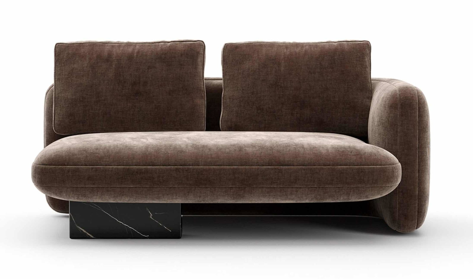 Product Description: Caracole UPH-425V-RL5-A Overlap RAF Loveseat Dark Taupe - Richly sophisticated, the Overlap RAF Loveseat is luxuriously upholstered in deep dark taupe vintage velvet fabric. Set atop a distinguished Nero Marquina stone base, it promises moments of chic comfort and graceful style.