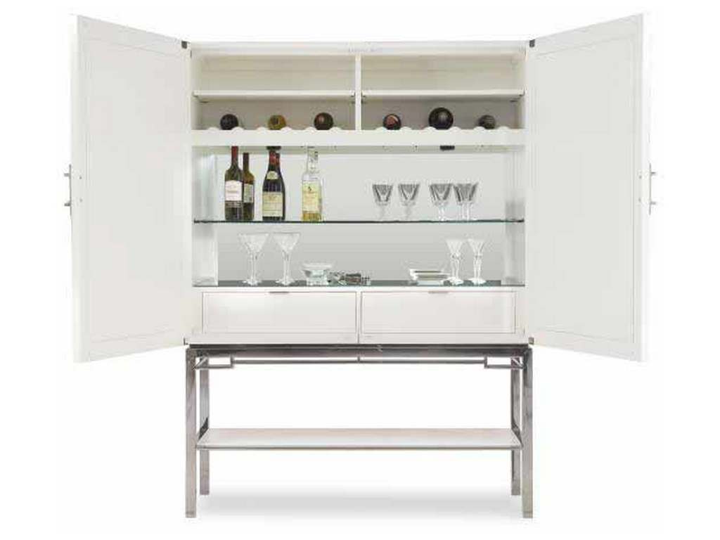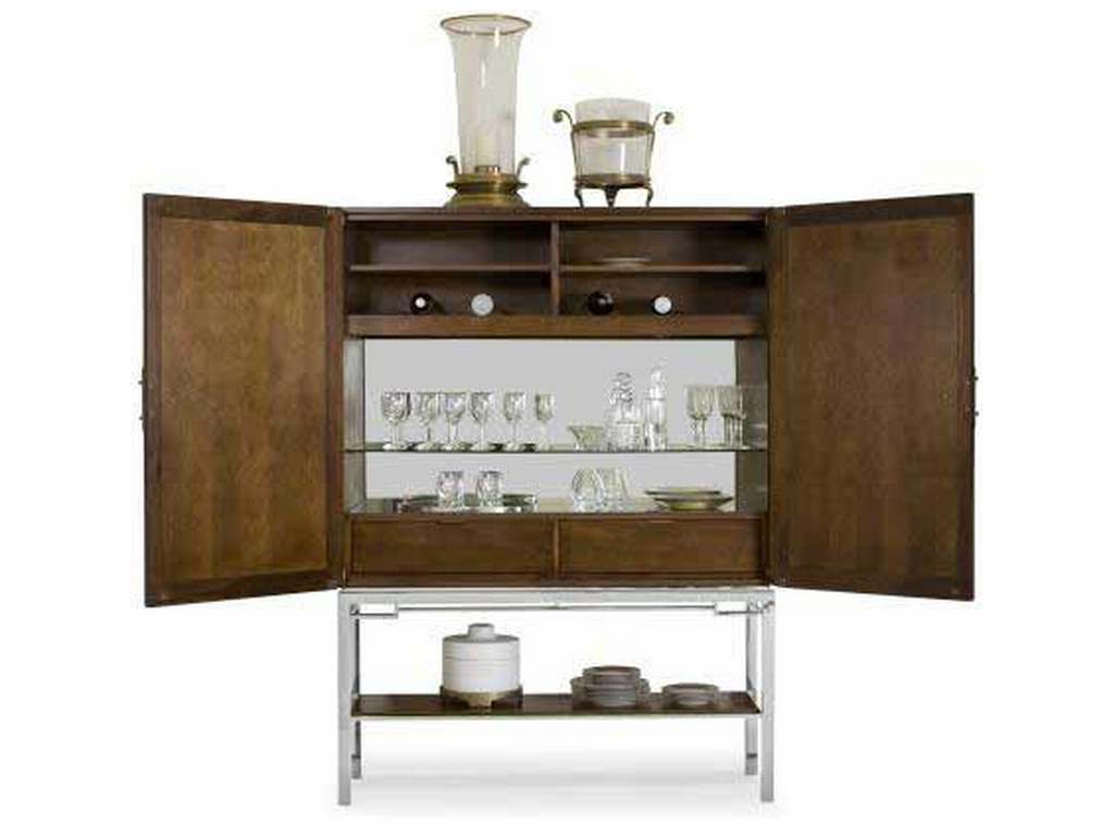 Product Description: Century Furniture 699-462 Lotus Bar Cabinet - Behind two doors is one adjustable wood shelf on either side of center partition above single fixed shelf with removable wine bottle storage strips, one adjustable glass shelf above fixed shelf with mirror work surface above two drawers. Mirrored back panel and LED interior lighting. Black nickel plated metal base with one fixed wood shelf.