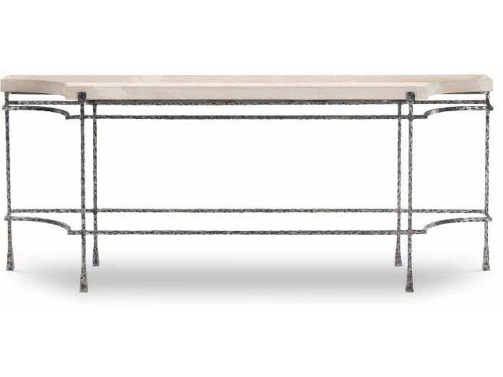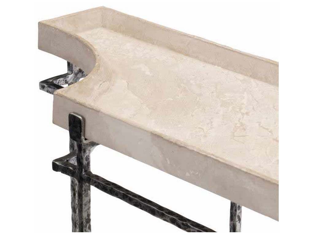 Product Description: Century Furniture 70A-723 Cortez Console Table - The Cortez Console Table features a blackened, hand hammered iron base with clipped concave corners and flared feet support a deep tray top that mirrors the same clipped corners. The tray top is cast from desert tan scagliola.