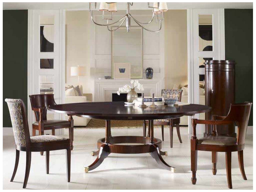 Product Description: Century Furniture AE9-302 Chandler Telescoping Table - The Chandler Telescoping Table by Thomas O'Brien for Century is a true work of design, engineering and art. Meticulously engineered parts allow this dining table to transform from 60" in diameter to 84" in diameter with the addition of eight beautiful leaves. The brass trim on the leaves ties back to the ferrules on the four supporting legs on the base making this table exquisite both on the top and base.