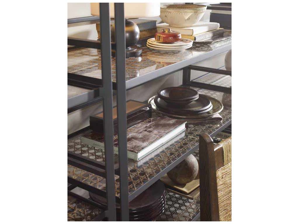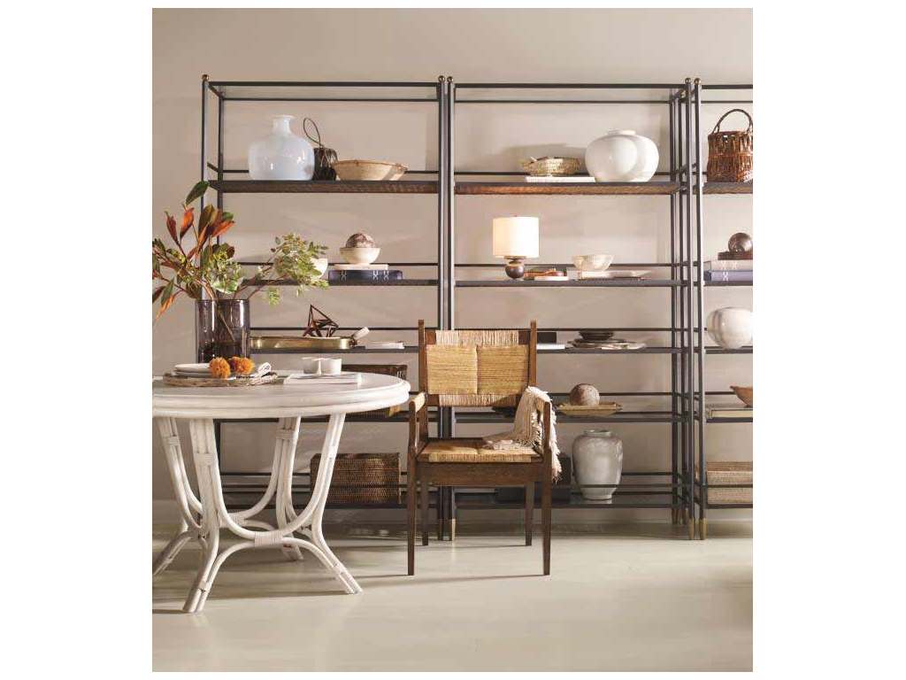 Product Description: Century Furniture AEA-805 Tom Tom Etagere - Airy wrought iron and woven cane create the mixed materials for a set of side and nesting tables, an etagere, and a console. The form is based on a longtime favorite set of small stacking iron tables with classic cane weaving that I've had for many years. Both the etagere and console have added rails so that they can be used easily as a bar table or shelf.
