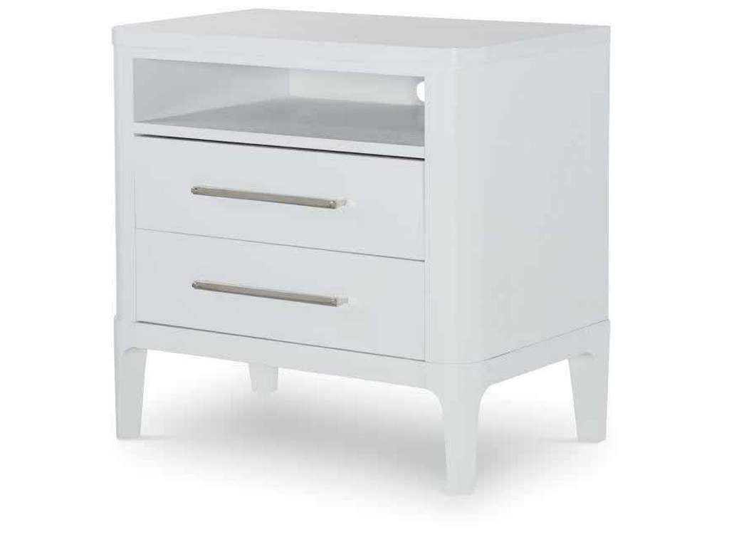 Product Description: Century Furniture C49-222 Bowery Place Nightstand - Two drawers with polished stainless steel hardware and soft-close drawer guides below open shelf.