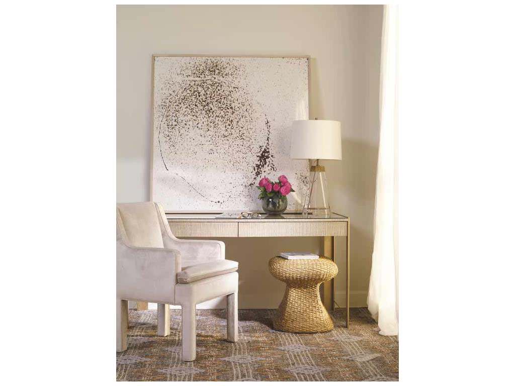 Product Description: Century Furniture C7A-762 Frederick Desk - Featuring flat, gilded metal legs, a raffia-wrapped desk top with drawers incorporated into the apron, and clear glass surface, Frederick works equally well as a writing table or vanity. The textured case and patinated frame add richness to the minimal design.