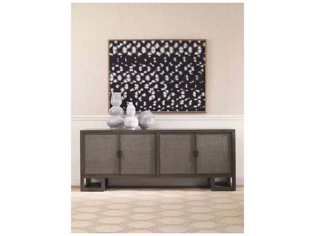 Product Description: Century Furniture CT4022-MK Curate Mackinaw 4 Door Credenza Mink Grey - Our Mackinaw credenza is crafted from Mahogany solids and veneers with natural woven cane on the door faces lending the piece a soft casual feel. Designed with solid brass pewter finished hardware. Two sets of doors open to reveal ample storage. Behind the two right facing doors are three tray drawers on either side of a center partition and behind the left doors is a wine rack and one adjustable shelf with center partition between them.