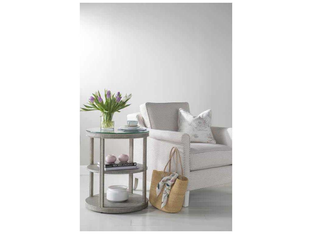 Product Description: Century Furniture CT5013-FG Monterey Tier Table French Grey - This modern round side table featuring a nickel nail trim that curves around its silhouette is wrapped in fine Saguran raffia, hand woven on the island of Bohol in the central Visayas region of the Philippines from the fibers of the Tipot palm tree. This raffia features a rich dimensional depth not found in lesser machine woven grasscloth. One fixed shelf. Comes standard with a lay on glass top.