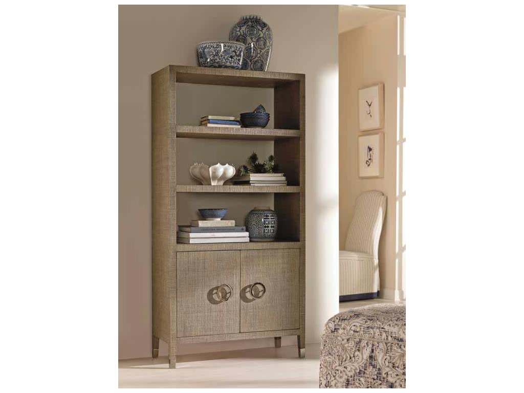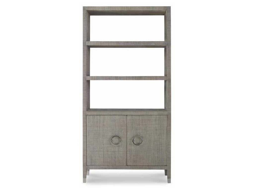 Product Description: Century Furniture CT5018-FG Charleston Bookcase French Grey - The Charleston Bookcase is a decidedly modern piece crafted of Mahogany solids and wrapped Saguran raffia, hand woven on the island of Bohol in the central Visayas region of the Philippines. Using the fibers of the Tipot palm tree this raffia features a rich dimensional depth not found in lesser machine woven grasscloth. Tapered legs with chrome plated ferrules. Two fixed shelves above two doors with chrome plated hardware. Behind the doors is one adjustable shelf.