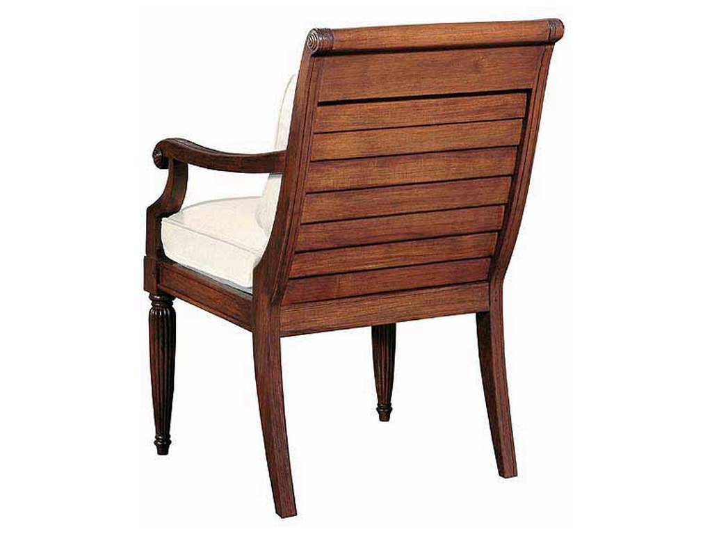 Product Description: Century Furniture D11-52 Archipelago Dining Arm Chair - Distinctive design featuring authentic British and Dutch Colonial plantation shutter back styling. Details include turned and reeded legs, V-grooving and rosettes. Sweeping back leg complements the Gondola-style and contoured upper back of the chair.