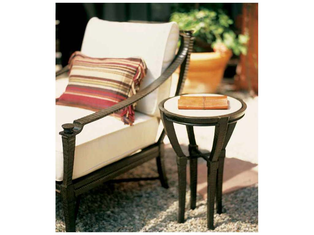 Product Description: Century Furniture D12-83-1 Andalusia Occasional Table - Classic Spanish-Mediterranean styling. Saber detailing and decorative fob accents featured on all pieces. This small side table was designed for indoor or outdoor placement. It has a hand-made, sand-cast aluminum frame that has the look of hand wrought iron and is finished in Cordoba, a durable, weather resistant, multi-step antique powder coat. The travertine stone top has a hue specially chosen to complement the coloration of this collection. The travertine stone top is made up of two pieces of stone. Smaller, but taller, it is the perfect complement to hold your favorite cocktail on a warm lazy day.