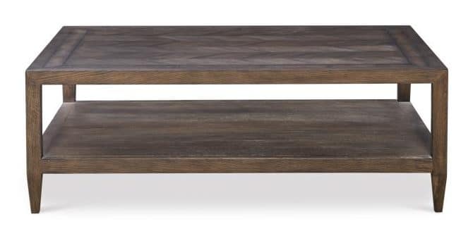 Product Description: Century Furniture B2H-603 Dalton Cocktail Table Brown Rustic - Stylish, rectangular cocktail table with a rich brown rustic oak finish and a distinctive herringbone-patterned wood top. It features a large open shelf at the base for storage or display.