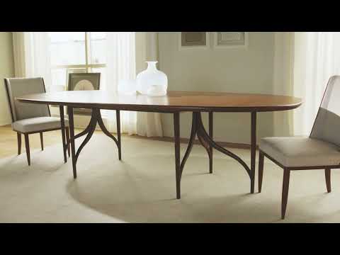 Product Description: Century Furniture C79-303 Quentin Dining Table - The Quentin Dining Table has a sinuous mid-century silhouette. The elegant, tapered legs incorporate wishbone inspired supports for a graceful and sculptural base on oval top with a soft, rounded edge. Built from walnut solids with walnut veneer, the dining tabletop shows the rich figuring in the wood. This statement table brings warmth and refinement to any room.