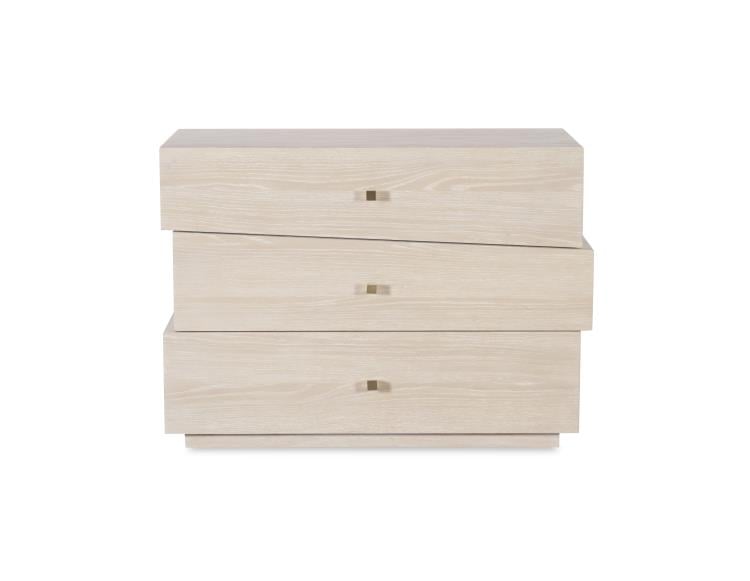 Product Description: Century Furniture CA2-702 Cadence Three Drawer Chest - Sand Cerused - The Cadence Three Drawer Chest features an asymmetrical, stacked drawer formation all resting on a plinth base. Each of the three push latch drawers are cut slightly off square adding to the sculptural quality of the chest which is yet also functional. Crafted in Oak solids and narrow heart oak veneer on top, this chest is a true work of art. Finished in Sand Cerused, a warm, neutral finish with the cerusing highlighting the grain of the oak.