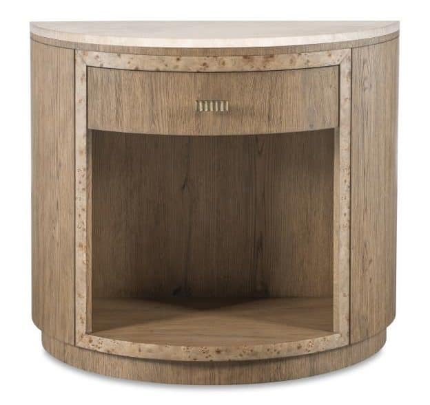 Product Description: Century Furniture CBA-221M-V1 Monterey Demilune Nightstand with Travertine Hawthorne Light - Refined, transitional nightstand featuring a warm Hawthorne Light oak veneer with honed travertine top. It offers one soft‑close drawer with aged bronze hardware above an open lower shelf.