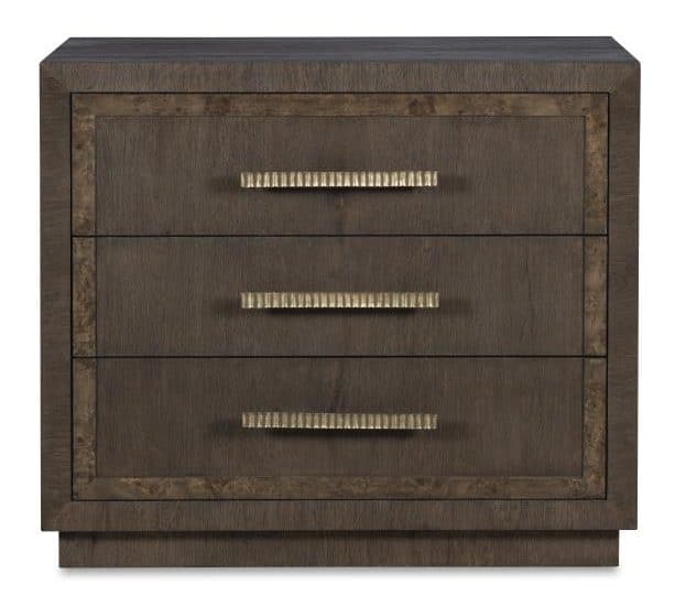 Product Description: Century Furniture CBA-223-V2 Monterey Three Drawer Nightstand Hawthorne Dark - Transitional style three drawer nightstand in a rich Hawthorne Dark finish. It features oak and mappa burl veneers with soft‑close drawers and aged bronze hardware, offering generous bedside storage with warm, refined appeal.