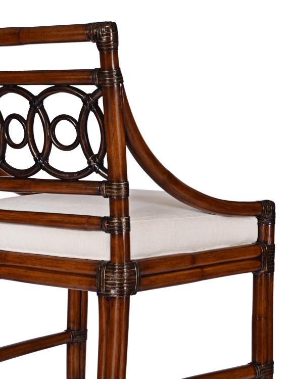 Product Description: Century Furniture CT2007B-FL Circles Bar Stool-Flax - Our Circles Bar Stool features an interlocking circle design crafted from rattan framing with leather accents in honey and ebonized black two-tone finish. Upholstered with a linen flax color upholstery.