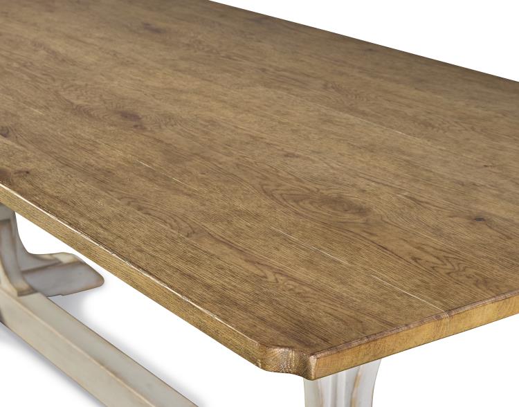Product Description: Century Furniture TSA-304-96-V1 Lucca 96 Inch Dining Table Wood Top - The 18th-century inspired Italian trestle based table showcases the rustic charm and practical design typical of Italian furniture from this period, often used in monastic settings or rural homes. The table's dual top options—one in marquetry sandblasted Carrara marble and the other in oak— reflects the versatility and adaptability of Italian craftsmanship, combining both decorative and functional elements. The use of Carrara marble, renowned for its quality and beauty, alongside the more humble oak, illustrates a blend of opulence and simplicity, capturing the essence of Italian design that balances elegance with everyday utility.