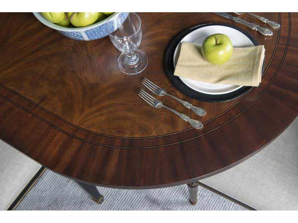 Product Description: Century Furniture MN5445 Barrington Dining Table - This Regency-inspired oval dining table is beautifully crafted from distressed mahogany, boxwood, and cerajeira crotch veneers. Fluted aprons and sturdy tapered legs add refined detail, while the distressed black and gold finish pairs elegantly with a warm, distressed mahogany top. Two 24-inch leaves conveniently store inside the tabletop cavity, keeping them protected and ready to use whenever additional seating is needed.