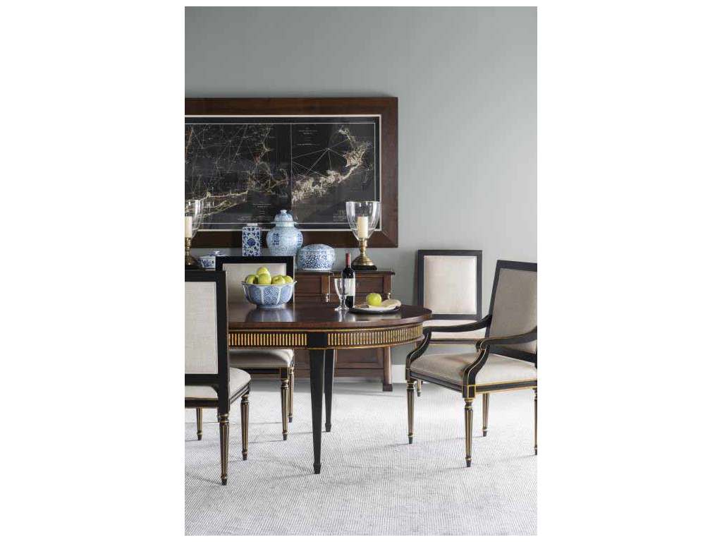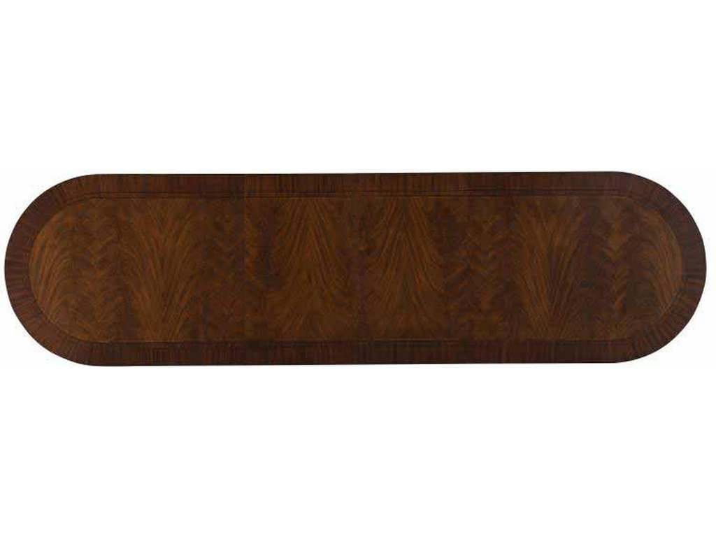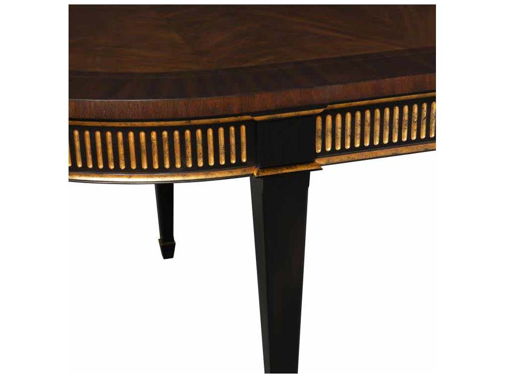 Product Description: Century Furniture MN5445 Monarch Barrington Dining Table - This Regency inspired Oval Dining Table features the finest mahogany, boxwood and cerajeira crotch veneers, fluted aprons & bold tapered legs all finished in a distressed black, gold and warm mahogany finish. The two 24" leaves store conveniently inside the top cavity protected and out of the way.